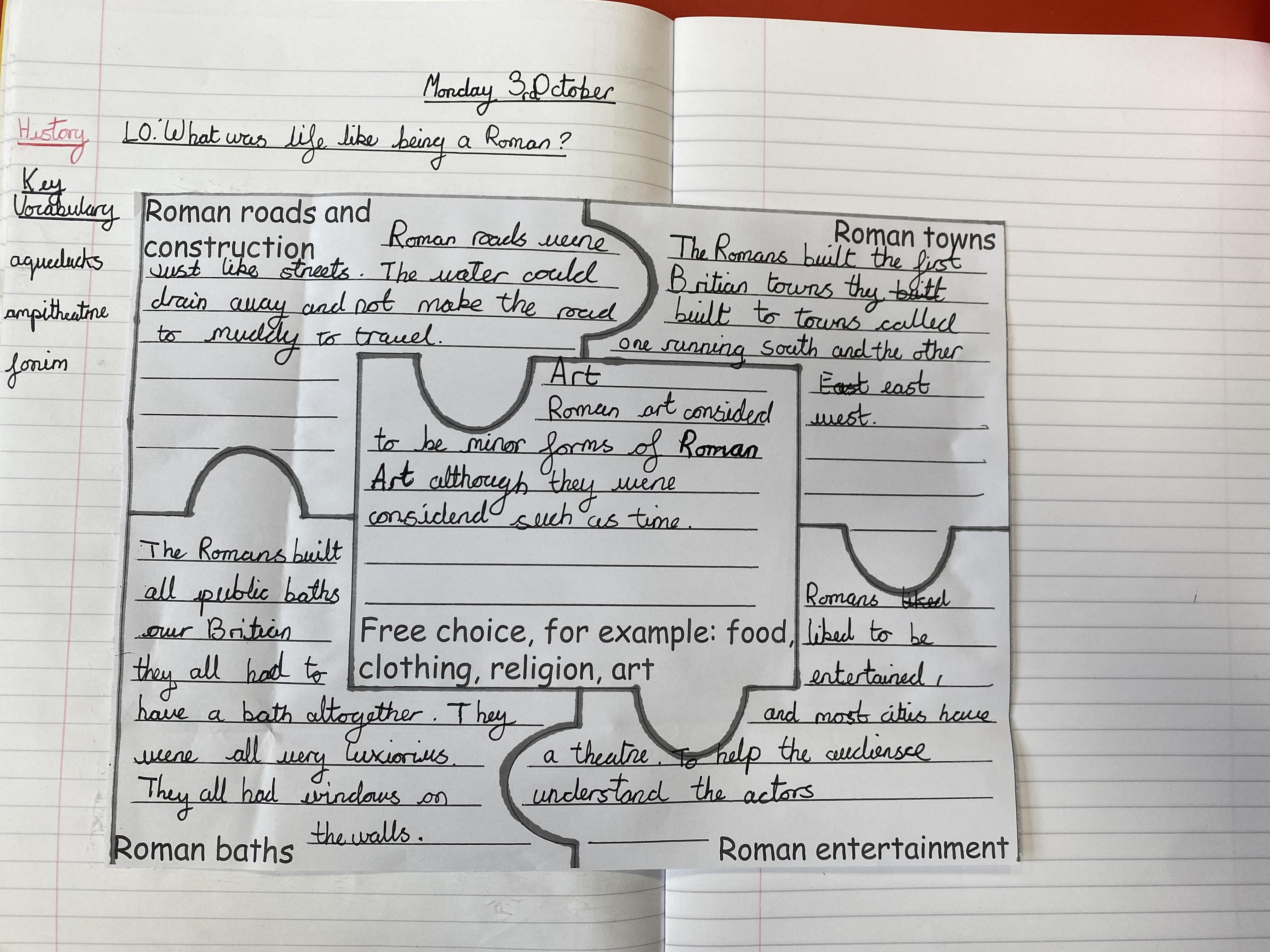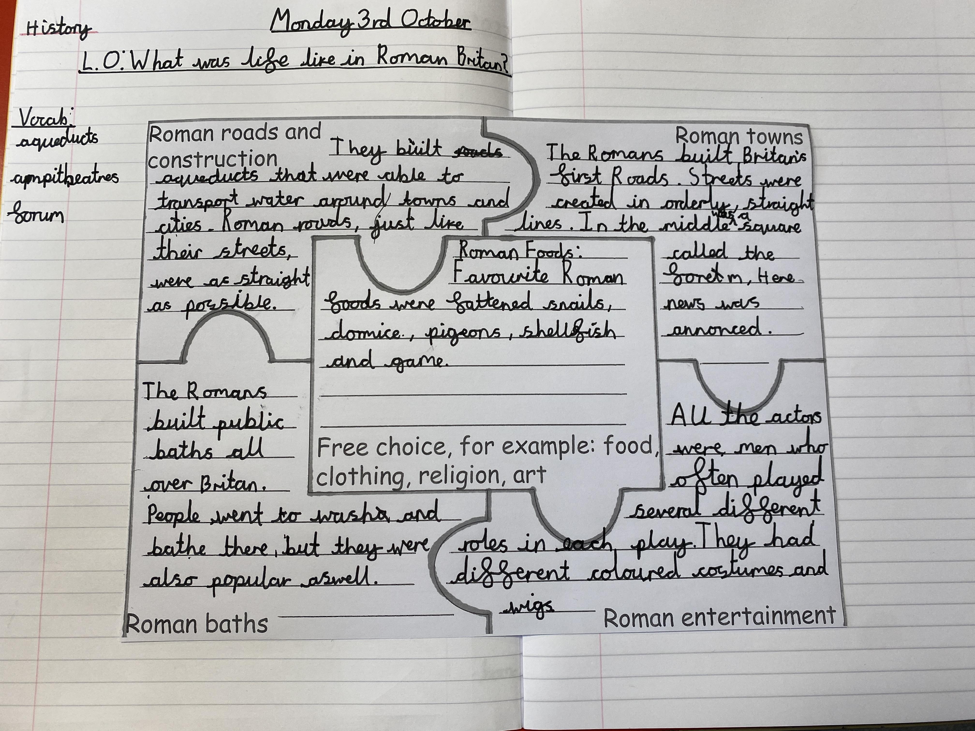 In History, Class 4 used information cards to gather and piece together their research in order to create a full picture on their jigsaw record sheet of what life was like in Roman Britain: